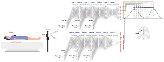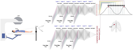 Figure 8 shows the time-series deep-learning regression-based algorithmic scheme for prediction of the lung tumor displacement. Specifically, the proposed time-series deep-learning regression-based prediction model is used to predict the lung tumor displacement along the longitudinal axis (in the head–toe direction). The proposed time-series deep-learning prediction model is applicable to predicting the lung tumor displacement in the head–toe direction because the lung tumor motility is predominantly along the longitudinal axis [10].