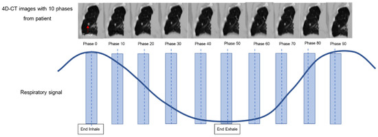Specifically, this research systematically selected 10 breathing cycles per patient [23], where a single breathing cycle consisted of an inhalation and an exhalation (i.e., one inhalation plus one exhalation is one single breathing cycle). Each breathing cycle was subsequently segregated into 10 respiratory phases, consisting of phases 0%, 10%, 20%, 30%, 40%, 50%, 60%, 70%, 80%, and 90%, where the 0%, 10–40%, 50%, and 60–90% respiratory phases represent the end-inhale, mid-exhale, end-exhale, and mid-inhale phases, respectively, as shown in Figure 2. Given the 40 lung cancer patients (20 patients each with regular and irregular breathing patterns), the total number of images in each dataset was 400 (10 respiratory phases per patient × 40 patients with lung cancer), consisting of 200 image datasets each for the patients with regular and irregular breathing patterns.