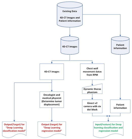 To further enhance the performance of the time-series deep-learning classification and regression-based prediction models, the input (feature) dataset for training and testing both models also incorporated the patients’ specifics, including the lung cancer patients’ age, weight, height, breaths per minute (bpm), heart rate (HR), and midpoint of the cancer position (x, y, z) [24] in addition to the Kinect-generated chest wall movement data. In this research, the midpoint of the cancer position (x, y, z) was used as an input (feature) in place of the size of the lung tumor. Figure 3 shows the diagram of the acquisition and preparation of the patient-based datasets.