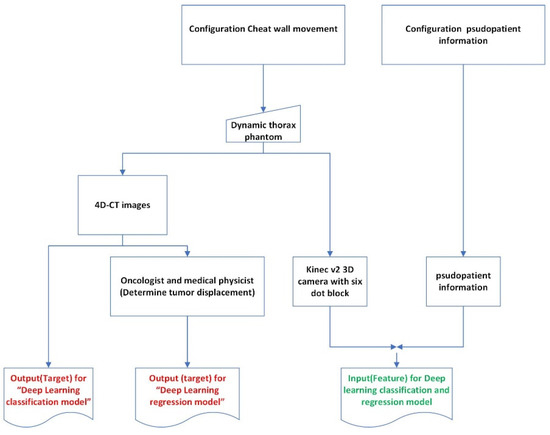 Meanwhile, the pseudopatient-based input (feature) dataset for training and testing both models was the pseudopatients’ external chest wall movements tracked by the Kinect v2 3D camera and the six-dot marker block placed on top of the thorax phantom, giving rise to 6000 Kinect-generated chest wall movement datasets. To further enhance the performance of the time-series deep-learning classification and regression-based prediction models, the input (feature) datasets for training and testing both models also incorporated the pseudopatients’ specifics, including age, weight, height, bpm, HR, and midpoint of the cancer position (x, y, z) [24], in addition to the Kinect-generated chest wall movement data. Figure 4 shows the diagram of the acquisition and preparation of the pseudopatient-based datasets.