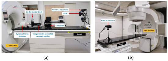 Figure 5a depicts the equipment setup used to collect the patient- and pseudopatient-based datasets for training and testing the time-series deep-learning classification and prediction models. The data collection was carried out by using the CT simulator, the dynamic thorax phantom, and the external surrogate device. Upon the completion of the training and testing, the Kinect camera scheme driven by the deep-learning classification and regression-based prediction algorithms (i.e., the time-series deep-learning Kinect scheme) would be utilized with a medical linear accelerator (LINAC) and another Kinect v2 3D camera with the six-dot marker block to individualize the delivery of high-energy X-rays or electrons in cancer treatment, as shown in Figure 5b. A medical LINAC is the device commonly used for external beam radiation treatments for patients with cancer. With the proposed time-series deep-learning-driven Kinect scheme, external beam therapy (i.e., a LINAC machine) could be designed in such a way that it destroys the cancer cells with pinpoint accuracy while sparing the nearby healthy tissue.