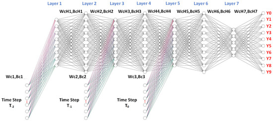 where is the actual output probabilistic value and is the predicted output probabilistic value. The gradient descent iterative optimization algorithm was applied to optimize W and B (Wc1, Bc1; Wc2, Bc2; Wc3, Bc3; WcH1, BcH1; WcH2, BcH2; WcH3, BcH3; WcH4, BcH4; WcH5, BcH5; WcH6, BcH6; and WcH7, BcH7) by using Equation (7) [26] and the chain rule derivative.