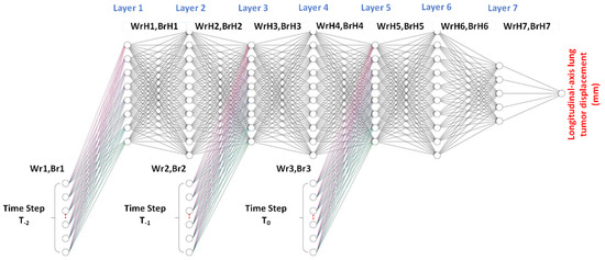 In Figure 9, the patient- and pseudopatient-based input (feature) datasets at time T0, T−1, and T−2 are fed into the respective input nodes. Each time period comprises 11 input nodes, consisting of the x, y, z coordinates from the six-dot marker block (3 features) and patients’ specifics (8 features, including age, weight, height, breaths per minute, heart rate, and the x,y,z coordinates of the midpoint of lung tumor). The T−2, T−1, and T0 input (feature) datasets were independently fed into hidden layers 1, 3, and 5, given as Wr1, Br1; Wr2, Br2; and Wr3, Br3, respectively, where Wr and Br are the weight and bias coefficients of the input (feature) of the regression-based prediction model. In the training process, Wr1, Br1; Wr2, Br2; and Wr3, Br3 were optimized by the gradient descent iterative optimization algorithm with a learning rate (α) and an epoch of 0.1 and 5000, respectively. In addition, to avoid the gradient vanishing problem, shared weights and biases were used for Wr1, Br1; Wr2, Br2; and Wr3, Br3.