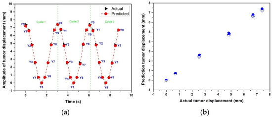 Figure 12a,b show the actual and predicted results of the time-series deep-learning classification and prediction models for the pseudopatient-based datasets with a regular breathing pattern. Figure 12a compares the actual and predicted respiratory phases and lung tumor displacements. The classification model correctly determined all respiratory phases with a lung tumor in all breathing cycles. The MSE, MAE, and R2 of the time-series deep-learning regression-based prediction model are 1.2%, 0.7%, and 0.97, indicating that the proposed regression-based prediction model can predict the lung tumor displacement with high accuracy.