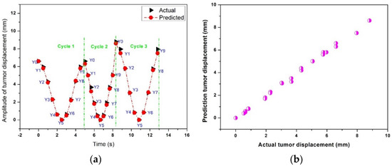 Figure 10b shows the scatter plot between the actual and predicted lung tumor displacement using the time-series deep-learning regression-based prediction model. The relationship between the actual and predicted lung tumor displacement is nearly linear, suggesting that the proposed predication model can predict the lung tumor displacement with high accuracy.
