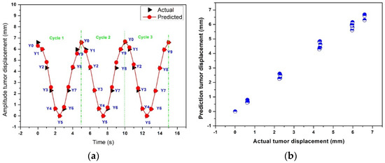 Figure 11b shows the scatter plot between the actual and predicted lung tumor displacement using the time-series deep-learning regression-based prediction model. The relationship between the actual and predicted lung tumor displacement is nearly linear, suggesting that the proposed prediction model can predict the lung tumor displacement with high accuracy.