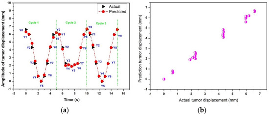 Figure 12b shows the scatter plot between the actual and predicted lung tumor displacement using the time-series deep-learning regression-based prediction model. The relationship between the actual and predicted lung tumor displacement is nearly linear, suggesting that the proposed prediction model can predict the lung tumor displacement with high accuracy.