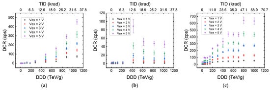 Next, we show the effect of radiation damage on DCR. In Figure 1, three of the characterized 55 nm SPADs are shown. All DCR measurements were performed at five different excess bias voltages (Vex). The lower and upper horizontal axes represent the cumulative DDD and TID, respectively. Three different behaviors of DCR under increasing cumulative dose can be observed. Figure 1a shows a SPAD with continuous growth in DCR as a function of the cumulative dose. Figure 1b shows how SPAD DCR peaks at a certain dose and then starts to drop during irradiation. This behavior is the most counter-intuitive one, but in fact, most SPADs exhibit this trend at some point during irradiation. This kind of short-term relaxation is also reported in [27]. Figure 1c shows one SPAD with a stepwise increase in DCR. To the best of our knowledge, this behavior has not been reported elsewhere to date. All these characteristics are observed in multiple SPADs. Most DUTs show a mixture of the aforementioned behaviors.