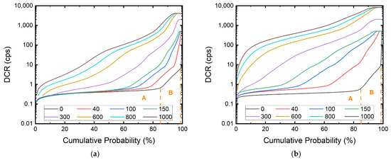 Finally, we can see how hot pixels, defined as pixels with a DCR significantly higher than the median DCR, are evolving in Figure 2. Before irradiation, there are two clear knees at 85% and 99% cumulative probability where the pixels show one or more orders of magnitude higher DCR than the rest of the pixels. This is commonly seen in large format SPAD arrays [9,17,40]. As the DDD increases, we can see that the two knees shift towards the left, indicating the number of hot pixels is increasing progressively. The difference in DCR levels is likely to be caused by different types of defects within the silicon bulk or silicon–oxide interface. During fabrication or receiving radiation, interface defects, oxygen–vacancy, phosphorus–vacancy, boron–vacancy, and more different complexes can emerge [41,42]. All these defects result in deep-level traps. Depending on the type of defect, the electron and hole traps will emerge at different energy levels within the bandgap of silicon. From the Shockley–Read–Hall model and Fermi–Dirac statistics, we know that the generation and recombination rate of charged particles is dependent on the position of the trap energy within the bandgap. From the difference in DCR levels, we can speculate that they are originating from the difference in trap energy levels. The knees are also less apparent at a higher cumulative dose, which can be the indication of all types of defects being formed uniformly within the array.