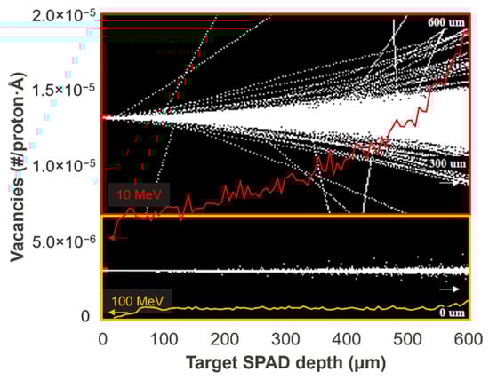 We can see that the DUT exposed to 10 MeV protons suffer from a more significant DCR increase compared to the one under 100 MeV at the same DDD. This is because, despite the fact that both samples received the same total dose, the damage created at the depth of the photocollector region is different. This was verified using Transport of Ions in Matter (TRIM) simulation, which allows the estimation of transport of atoms due to ion collision. The simulation result is shown in Figure 3. In this figure, the protons enter silicon from the left side and interact with silicon. The trajectories of the protons are shown in white. We can see how 10 MeV protons interact with silicon more while the 100 MeV protons penetrate the silicon chip without much scattering. The orange and red curves show the number of vacancies per proton per angstrom in depth created by 100 MeV and 10 MeV protons, respectively. The estimated displacement damages at the depth of the photocollector region given by 100 MeV and 10 MeV are 7 × 10−7 and 7 × 10−6 vacancies/proton·Å, respectively. With the different total fluences delivered that are shown in Table 1, the estimated defect counts within the active region of each pixel are 43 and 140 for 100 MeV and 10 MeV protons, respectively. The ratio of the defect counts of the two DUTs, roughly 1:3, matches the ratio of the final mean DCR for both DUTs, which is shown in Figure 4. In the case of the DUT irradiated with 100 MeV protons shown in Figure 4a, the exposure was discontinuous and separated into three days due to the beamtime arrangement. The drop in mean DCR between doses on different days is evidence of room-temperature annealing.