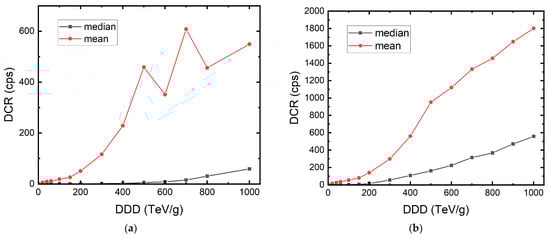 where DCR0 (in cps) is the original DCR before radiation assuming no afterpulsing. The second term in the numerator represents the linear increase in the primary dark count or the linear increase in the leakage current of a diode due to the increase in the number of defects. Kd (in carriers per cm3 per MeV/g) is a constant called damage factor that describes the rate of damage given by the radiation source, and Vdep (in cm3) is the depleted volume [27,52]. In other words, the primary dark count will indeed be linearly proportional to the DDD. The numerator represents the total primary DCRrad after receiving a certain dose of radiation. The denominator is the scaling term considering afterpulses caused by primary dark counts, which is derived in Equation (3).