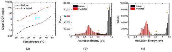 From Figure 5b,c, we can observe the Eact of the pixels before and after 100 MeV and 10 MeV irradiation. Before irradiation, we can identify two groups of pixels, A and B, with Eact of ~1.1eV and ~0.8 eV, respectively. These two groups correspond to the two groups of SPADs shown in Figure 2, where the two knees are presented. This is proof of the correlation between the trap energy and the DCR level. Before irradiation, the DCR of the pixels is determined by the type of the existing defects from the fabrication process.