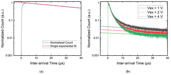 Afterpulses can occur when charge carriers, which were trapped from previous avalanches, are released. Depending on the SPAD breakdown probability, these released carriers may ignite another avalanche, thereby contributing to the overall DCR. Afterpulsing can be measured by putting the SPADs in a dark environment and measuring the inter-arrival time of noise pulses. For a Poisson process, the inter-arrival time should follow an exponential distribution. Since the primary dark count is a Poisson process, the inter-arrival time histogram should present a single exponential decay in the absence of afterpulse, whereas the contribution above the exponential fit is defined as afterpulsing [47]. Here, we define APP as the number of pulses above the exponential fit divided by the total number of pulses. The definition is expressed in Equation (1).