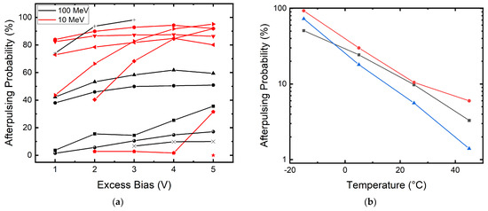 In Figure 6a, a SPAD with negligible afterpulsing before radiation is shown. The majority of the DUTs showed APP < 1% before radiation damage. In Figure 6b, afterpulsing characterization was performed on the same SPAD with different excess biases after radiation damage.