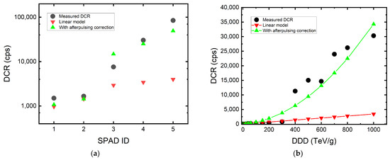 In Figure 8, we compare the proposed model shown in Equation (4) with the known linear model. We used the megapixel SPAD camera to acquire the mean Kd. The Kd values of 100 MeV and 10 MeV protons are 6.7 × 104 and 2.2 × 105, respectively. This is similar to what has been shown in [52]. We then apply the acquired Kd and the APP to find the DCR. In Figure 8a, five measured SPADs are shown. We can see that the DCR values acquired with afterpulsing correction have much better accuracy for the SPADs with high DCR increase. However, the linear model, not considering the influence of afterpulsing, underestimates the DCR level.