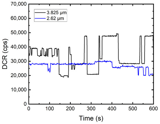 Two 55 nm SPADs showing DCR RTS at DDD of 80 TeV/g. The dark count at each second jumps between several DCR levels within a 600 s measurement. The black and blue curves represent SPADs with active area radii of 3.825 and 2.62 μm, respectively.