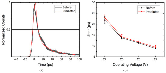 (a) Jitter measurement of the 180 nm accurate timing SPAD with 8.8 μm radius at 26 V operating voltage before and after radiation. (b) Jitter comparison at different operating voltages before and after radiation. The error bar represents the standard deviation between repeated measurements.