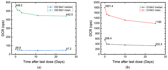 As already seen in Figure 1 and Figure 4a, room-temperature annealing can occur during irradiation or between days of discontinuous exposure. This is similar to the rapid self-annealing discussed in [25]. After the last dose of exposure, we kept all the DUTs under room temperature to observe this phenomenon. In Figure 11, we can see the DCR of the megapixel cameras drops rapidly within three days after the last dose of exposure, and then the decreasing rate slows down after four weeks. This is similar behavior to the one shown in [37]. It is clear how the sample that was exposed to 10 MeV has a larger DCR drop. The median DCR recovered percentages are 20% for the 100 MeV and 40% for the 10 MeV DUT. This can be due to the higher TID received by the 10 MeV sample since recovery from displacement damages is less likely under room temperature. It can also be seen that the mean DCR ratio of the two DUTs at the last measured day is still similar to the defect count ratio acquired from the TRIM simulation.