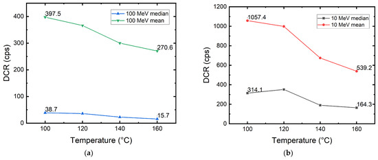 High-temperature annealing results of the 180 nm megapixel SPAD camera irradiated with (a) 100 MeV and (b) 10 MeV protons.