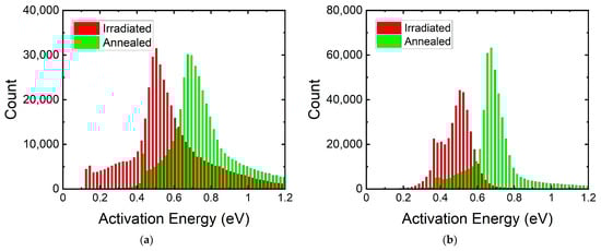 Finally, we compare the activation energy of the 180 nm megapixel SPAD camera after irradiation and after annealing. We can see in Figure 13 that the average activation energy shifts uniformly towards the bandgap 1.1 eV. The mean activation energy shifts from 0.5 eV to 0.7 eV. We can still see a distinctive population around 0.4 eV for both DUTs, indicating some phosphorus–vacancy complexes and divacancies remain unannealed.