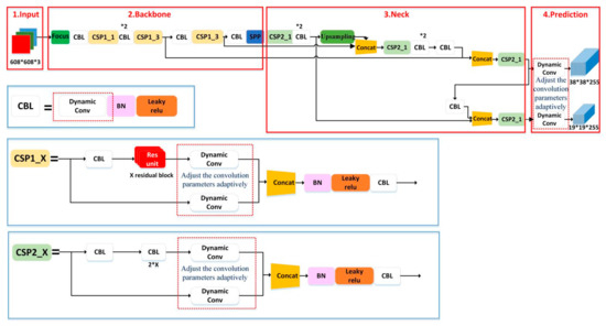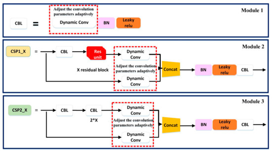 - Module 3 is the CSP2_X module. It is located in the neck layer of the network structure. It consists of Conv and X Res unint modules and Concat, which are replaced by dynamic Conv and X Res unint modules and Concat, as shown in Module 3 of Figure 2.