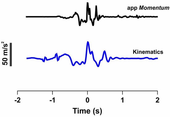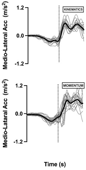 Figure 4 shows the resultant (from the ten attempts) of the medio lateral acceleration of the COM for each measuring device. This is a result figure presenting the similar characteristics between subjects and methods. Based on the images, in both the kinematics system and Momentum app, the COM presents the same behavior, indicating that in this study, both techniques characterized the events of the subjects similarly.