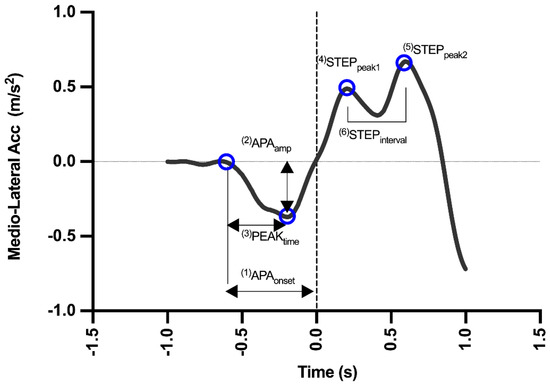 An average of ten trials was used for all calculations. The moment of heel-off was defined by the FS. After defining this moment, the trials were conducted within each series for each subject. Subsequently, the COM accelerations in the mediolateral (ML) direction, extracted from the records of the measuring instruments, were analyzed. ML axis was chosen, as it represented the main axis where APAs occur during step initiation [18]. Raw data coordinates from all signals on the mediolateral axis were generated from a video analysis and the Momentum app and subsequently filtered with a 10-Hz second-order low-pass Butterworth filter. Filtering was applied as published by Martinez-Mendez, Sekine and Tamura [18], by performing the power spectrum analysis of the signals, and the same cut-off frequency was employed for all the signals. Figure 3 presents a typical acceleration waveform expected for both devices used in the present method. The following are the calculated and exported step parameters:
