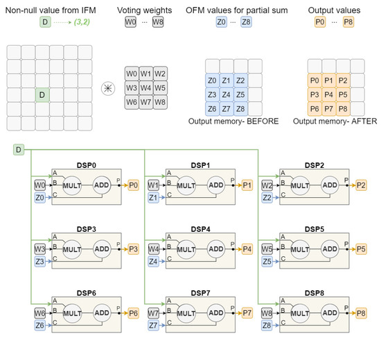 The Voting Block Processing Unit can then be represented as a set of DSPs, proportional to the filter size used, where multiplications and additions are performed simultaneously. For the example illustrated, the input is a 6 × 6 Feature Map (FM) with only one non-null value and the convolution operation is performed with stride of 1. Assuming a filter size of 3 × 3, nine Digital Signal Processors (DSPs) would be responsible for multiplying the input value by one of the voting weights and also perform the sum with the value coming from the output memory. Thereby, each one of the DSPs will have its weight and partial sum value specifically associated. However, they all share the same input value where the convolution will be applied.
