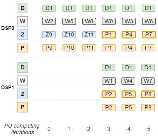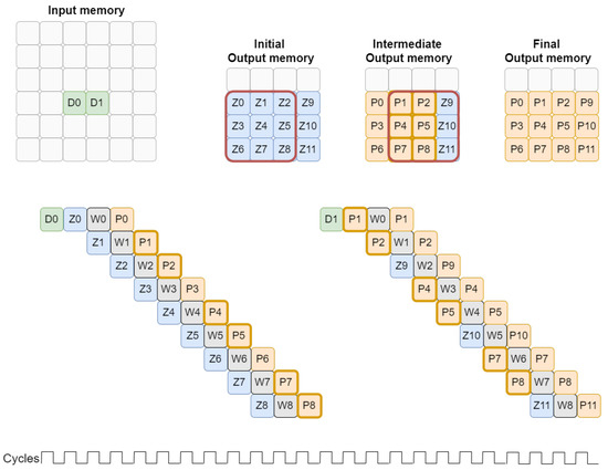The processing of two consecutively positioned non-null values in the input memory shares certain positions in the output memory. For the first convolution, the Z0–Z8 positions are read from the output memory and after all operations, and the P0–P8 values are written in the same positions. For the processing of D1, some output memory positions are shared with those read for D0 processing. Namely, the positions identified with values P1, P2, P4, P5, P7, and P8. These positions correspond simultaneously to the output of D0 processing and to the input of D1 processing.