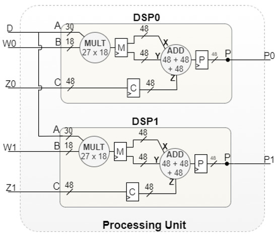 With the integration of the technique illustrated in Figure 4, in certain pipeline iterations, a maximum of two calculations are performed simultaneously. Evolving from the approach shown in Figure 2, the Voting Block Processing Unit is now composed of only two DSPs, as detailed in Figure 5. Each DSP needs to be configured to perform multiplication and addition operations, thus enabling the integration of the data reuse technique.