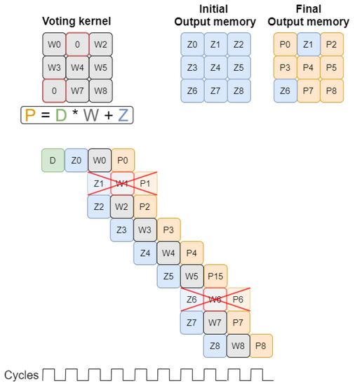 Figure 2 presents how the voting scheme-based convolution works. For a filter size of three, nine multiplications must be performed between the input value and the filter weights. The result of each multiplication must be added to the value already stored in the corresponding output position. After all operations have been performed, the results must be written back into the output memory.