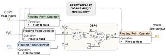 In resource-limited, high-performance, and low-latency scenarios, data quantization is required to compress the model according to the memory available in the target board and to enhance power efficiency and performance in terms of inference time. In situations where the network is running on a platform with low resource limitations, the data are usually a 32-bit floating point. To enable the hardware to process the data and reduce hardware design complexity, data quantization is adopted. Targeting an integration in a model that operates with floating-point numbers, input data need to be quantized before participating in the Processing Unit internal operations. In our design, the Xilinx Floating-Point Operator IP is used to perform this quantization. The quantization level can be customized individually for the weights and the feature map values.