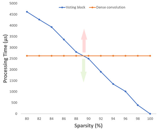 For a 512 × 512 feature map (total of 262,144 values) with sparsity levels between 80% and 100%, different performance tests were carried out to evaluate the processing time evolution according to the sparsity level variation. From Figure 10, the higher processing time registered for the Voting Block was around 4600 microseconds while the lower one was 390 (when ignoring the test with sparsity level of one, since a 100% level of sparsity means that all values are null and no time is consumed to process the data). The orange line on the graph represents the time taken by a traditional convolution, which, as can be seen, is always the same, regardless of the sparsity level.