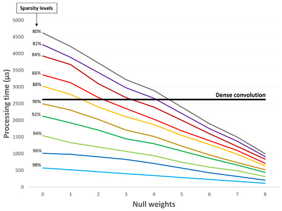 Figure 11 shows that null weights also have a good impact on the processing time regardless of the sparsity level of the input data. For instance, although the gray line registers higher processing times than the traditional convolution (black line), it becomes faster when the number of null weights is greater than five.