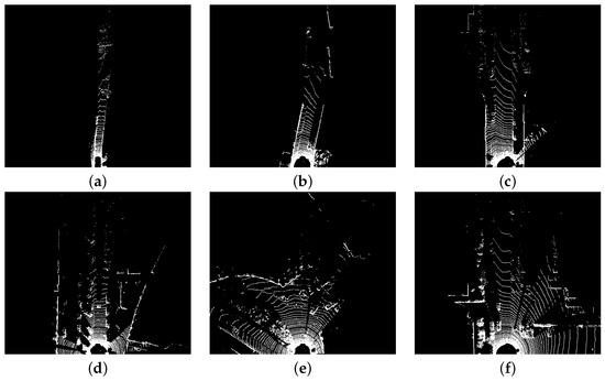 To prepare the data for the different sparsity level scenarios, several frames were selected from the Kitti dataset [28]. Figure 12 presents the frames’ representation in a black-and-white format to better distinguish the amount of null values in each one. The non-null values are represented with white pixels while the null values are represented with black ones. From each pseudo-image, it is possible to recognize the captured scene and the substantial difference in the number of values that need to be processed between the feature map with the highest Figure 12a and lowest Figure 12f sparsity level. Through the visual aspect of the images, it is possible to verify that greater sparsity levels are related to scenes with few objects and narrow roads which are present in both urban and rural areas. On the other hand, the level of data sparsity also depends on the characteristics of the 3D sensor such as range and angular resolution.