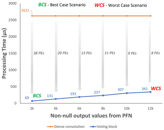 Taking into account that the size of the feature maps from the PFN is 512 × 512, the dense convolution implemented in the convolutional module always consumes the same time (2621 s) regardless of the feature maps sparsity level. Given the possibility of integrating parallelism in the dense convolution through the use of several processing elements, the gray arrows show the level of parallelism required for the processing to be as fast as the one in the Voting Block. Assuming a clock of 100 MHz, in the best-case scenario, the Voting Block only consumes 69 s, meaning that the dense convolution needs to allocate at least 38 PEs for the processing times to be approximately equal. Since, for the worst case, the Voting Block consumes more time, only eight PEs are required to decrease the processing time from 2621 s to 341 s.