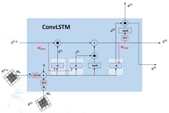 ConvLSTM is a convolutional neural network combined with an LSTM network. Thus, it is similar to LSTM, but convolutional operations are performed at layer transitions. The structure of ConvLSTM can be seen in Figure 1.