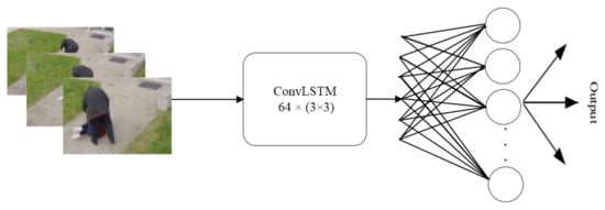 The ConvLSTM architecture using ConvLSTM layers has become popular for the extraction of features from video data. For this reason, the ConvLSTM layer in our proposed ConvLSTM was used. The proposed architecture consists of a ConvLSTM layer, a Conv2D layer (convolutional layer for 2D data), and a Time Distributed layer. The ConvLSTM layer contains memory and time continuity. The Conv2D layer is wrapped in the Time Distributed layer.