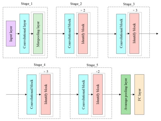 In general, classic ResNet is used to classify images and uses only 2D convolutional layers on 2D images. However, in this case, 3D convolutional layers are used; these layers are also shifted in the third dimension to extract the related elements between the images. 3D ResNet and the original overall ResNet architecture only replace convolutional 2D layers with convolutional 3D layers; the 2D pooling layer also needs to be replaced with 3D pooling. The classic Resnet50 architecture is shown in Figure 3. In our case, the architectures of 3D Resnet50, 3D Resnet101, and 3D Resnet152 were used. These architectures are different in terms of number of layers [21,22,23].