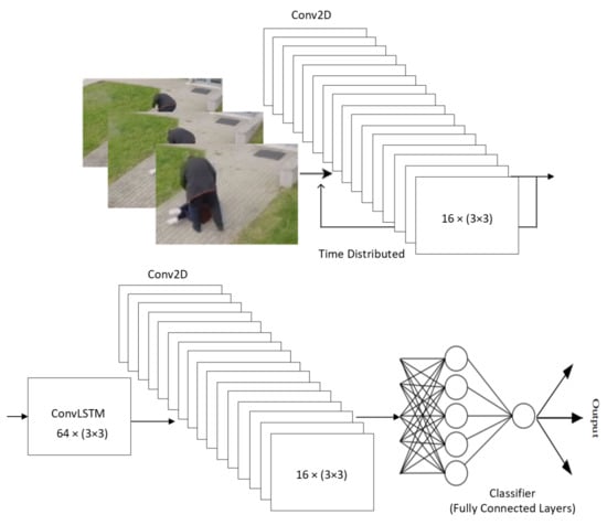 We have been working on this issue for a long time. For example, in previous articles [16,17], we dealt with the classification of human activities. In [16], we applied a 3DCNN (3D convolutional neural network) to datasets such as the UCF YouTube Action dataset, the modified UCF101 dataset, the full UCF50 dataset, and the full UCF101 dataset. In this article, we tested the ConvLSTM architecture on the UCF-crime dataset. In it, we classify video sequences containing different categories of abnormal activities/incidents using our proposed ConvLSTM architecture. We created a dataset for training and testing and called it Abnormal Activities. Section 1 describes the ConvLSTM architecture. Next, we describe the ConvLSTM proposed in the article [18]. We continue by describing the 3D Resnet network, which is also tested on our dataset. We then take a closer look at our proposed neural network architecture. In the Section 2, we describe a dataset that we designed and created called the Abnormal Activities Dataset. In the Section 3, we describe the obtained experimental results. The Section 4 is conclusions and discusion.