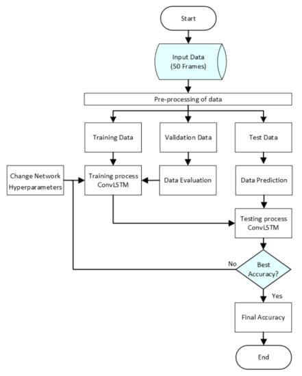 The flowchart of the proposed ConvLSTM of neural network is shown in Figure 5. The input to the neural network represents the width and height of the image and the number of video frames. Input data were cropped and edited (pre-processing). Data were divided into training, validation, and test data at a ratio of 70:20:10. The training process was run on training data. After that, the testing process was performed on testing data. Finally, the accuracy and confusion matrix were calculated. The output shape of each layer is shown in Table 1 and Table 2. These figures describe output shape, number of total parameters, and number of trainable and non-trainable parameters.