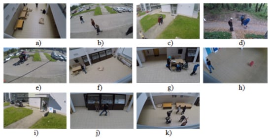 As part of our abnormal behavior classification research, we created a dataset called the Abnormal Activities Dataset. The dataset consists of videos with ten non-professional actors. The dataset contains 1069 videos. This dataset was divided into eleven classes (Begging, Drunkenness, Fight, Harassment, Hijack, Knife Hazard, Normal Videos, Pollution, Property Damage, Robbery, Terrorism), as shown in the Figure 6. These scenes were performed in different lighting conditions. During the creation of the dataset, our goal was to simulate the layout of the security camera system in public places such as in buildings, in parking lots, and in nature. The Abnormal Activities Dataset provides diversity mainly in terms of actions in real environments with the presence of different variations in camera motion, appearance and position of the examined object, different illumination conditions, etc. The complexity of the dataset is influenced by the choice of categories, some of which are very similar, such as the Knife Hazard and Fight categories. In the mentioned categories, the classification can be influenced by similar reactions of people to fighting, but also to being threatened with a knife, as well as similar movements during attacking and fighting. The categories of Drunkenness and Begging can also be very similar, as the drunkard also appears to annoy the people around him. These similarities between categories make the dataset we created more difficult to classify. Furthermore, all the categories created contain entries from different angles and backgrounds. Each category contains about 100 videos. In each video in all categories, the event takes place for the entire video, so the length of the videos ranges from about 1 s to 30 s. Videos in the same category may have some features in common, such as the same person, similar or the same background, and similar or the same camera angle. Uploaded videos are in .avi format. All videos were recorded by two different cameras. The first camera was the GoPro Hero 4 and the second was the Lamax X7. The GoPro Hero4 camera can record in 4 K resolution (UltraHD). It also supports lower video resolutions such as 1080 p, 720 p, and 480 p. It can record up to 120 frames per second, which is excellent for recording fast movements. The Lamax 7 camera can record in native 2.7 K resolution. It also supports lower video resolutions such as 1080 p, 720 p, and 480 p. It can record 60 frames per second.