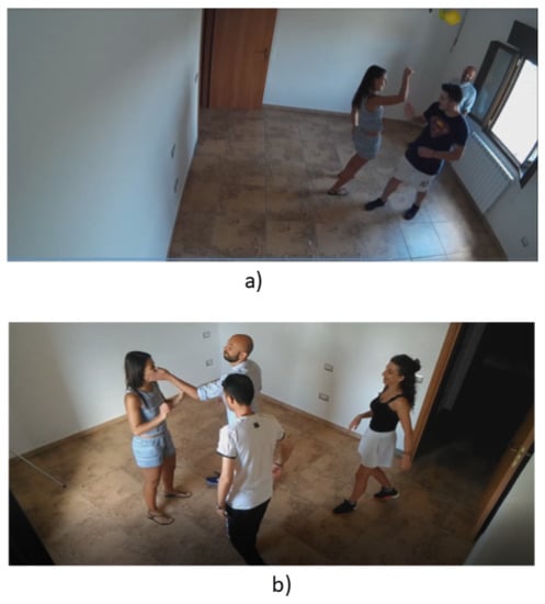 All clips were recorded in the same room, with natural lighting conditions, by placing two cameras in two different places (upper left corner in front of the room’s door and upper right corner on the side of the door). The clips were played by a group of non-professional actors ranging from two to four people per clip. In the violent clips, the actors were asked to simulate actions common in battles, such as kicks, punches, slaps, batting, stabbing, and pistol shots. In the case of nonviolent clips, actors were asked to simulate actions that could lead to false-positive results in violence detection techniques due to speed of movement or similarity to violent actions. Specifically, nonviolent clips include actions such as hugging, clapping, cheering, and gesturing. All actions in both violent and nonviolent clips were manually annotated. The dataset was adapted to specifically test resistance to false-positive results [18].