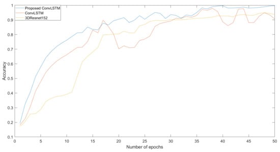 Comparison of accuracy during training process (ConvLSTM, 3D Resnet152, and proposed ConvLSTM).