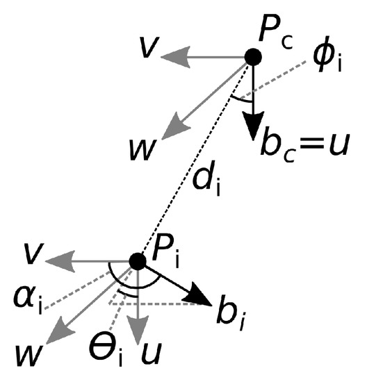The relative position of vectors and is described by , , and according to Equations (4)–(6) [33]: