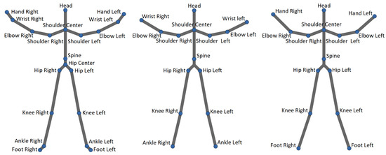 Three skeletons available in datasets: (left) MSRA, UTD-MHAD, UTK, and SYSU; (middle) FLORENCE; (right) KARD.