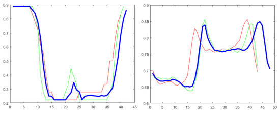Time series generated by ARSPAWNER (blue curve) based on two exemplary timeseries (red and green curves). The left plot represents “draw circle” action and the right plot represents “high arm wave” action from MSRA II dataset.