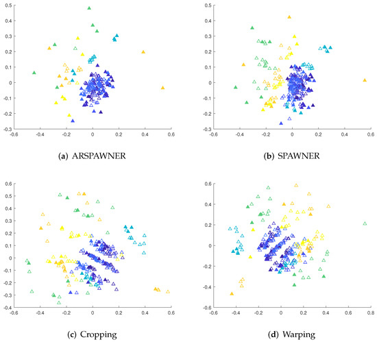 To show the areas in which new samples are generated by the augmentation methods from the MSRA I dataset, Kruskal’s nonmetric MDS [30] is employed. To facilitate the analysis, the first 60 actions are considered. MDS reduces the dimensionality of data samples and can be used with time series of different lengths by the usage of the DTW dissimilarity matrix. The matrix contains pairwise DTW distances between examples. The MDS representations of exemplary time series are shown in Figure 5. Input time series are filled while the colors indicate their classes. The proximity of samples from different classes or existing overlapped class boundaries illustrate the recognition problems. However, the introduction of new data samples in most cases improved the recognition accuracy of classifiers, it can be assumed that methods generating time series in areas within class boundaries are likely to lead to a higher recognition rate. As presented, ARSPAWNER generates fewer examples in areas occupied by representatives of other classes than in the case of the remaining augmentation approaches.