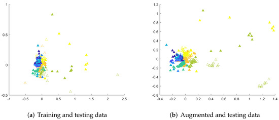 The 2D MDS embeddings of DTW dissimilarities between testing and training or testing and augmented sequences from the MSRA I dataset. Colors differentiate the classes, the filled triangles denote testing examples.