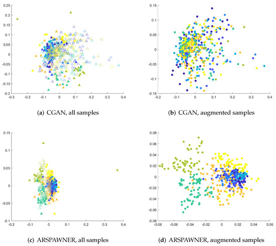 The accuracy of the classifier for three augmented MSRA datasets after PCA feature reduction is presented in Table 6. It can be seen that the classifier equipped with data generated by ARSPAWNER improves its accuracy by a large margin. The improvement can also be visible for CGAN-created data in the case of MSRA I. However, for the MSRA II and III datasets, creating synthetic samples led to a significant drop in the performance of the classifier. The problems with the generation of suitable data examples of CGAN are possibly caused by the lack of a sufficient number of learning data examples, challenging data examples in the dataset after reduction by PCA, and inefficiency of the employed network architecture. To better highlight encountered problems with CGAN architecture, the 2D MDS embeddings were created for the entire MSRA I dataset (Figure 7). As shown, input data samples are close to each other due to the usage of PCA reducing the dimensionality of the time series in the dataset. However, ARSPAWNER was able to create samples in large clusters (Figure 7d) in their proximity (Figure 7c). CGAN, in turn, created many samples across the feature space, with their representatives also located in places that belong to the neighboring classes (Figure 7a,b).